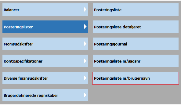 Ny rapport findes under Finansrapporter -> Posteringslister -> Posteringsliste m/brugernavn.