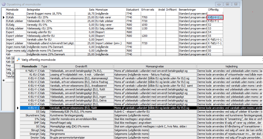 Gå i Opsætning -> Finansopsætning -> Momskoder. Gå ud i sidste kolonne "Offentlig" og vælg den Offentlige momskode. Forklaring til koden vises længst ud til højre i vinduet, som åbnes.
