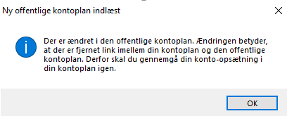 Når der kommer ændringer til den offentlige standardkontoplan fra Erhvervsstyrelsen, vil du få nedenstående besked. Det betyder, at din kontoplan skal løbes igennem og der skal mappes til de nye konti i Erhvervsstyrelsens offentlige kontoplan.