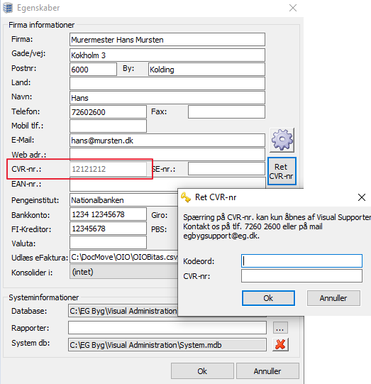 Det vil sige, at feltet CVR-nr. i egenskaber er spærret med en kode og kun kan låses op af EGByg Supporten, hvis CVR.nr. er forkert og skal rettes.