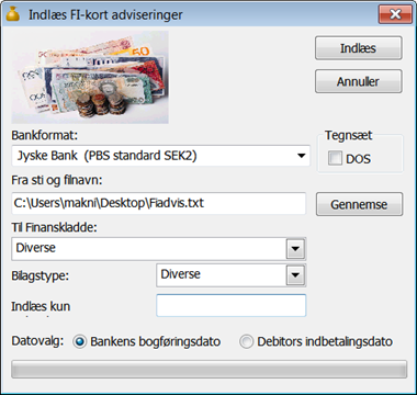 Gå ind i Visual og vælg Finans -> Indlæs FI-indb (klassisk menu: Funktioner -> Debitorer -> Indlæs FI-kort adviseringer).