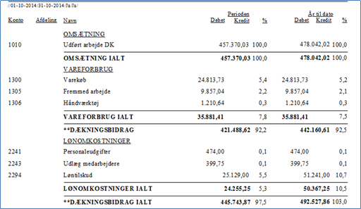 Kolonnen % vises på alle omkostningskonti, og viser hvor stor en del omkostningen udgør af omsætningen. Hvis udskriften ønskes med oms.Pct, skal der vælges "JA" i feltet "Med oms.Pct" når udskriften dannes