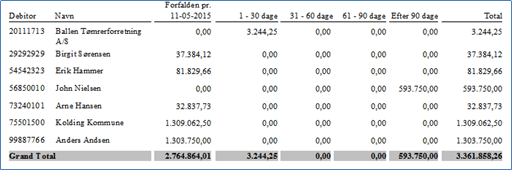 Specificeret aldersfordelt saldooversigt viser alle åbne poster, samt en visning af hvornår fakturaerne er udstedt. Denne kan benyttes som opgørelse til revisoren men skal trækkes på dato den skal bruges for at være retvisende da den korrigere for posteringer der er udlignet efterfølgende