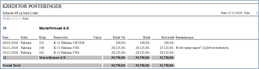 Posteringsliste kan f.eks. udskrives på kun åbne poster. Udskriften indeholder desuden evt. bemærkninger fra posteringerne (findes under Kreditor -> Kreditor udskrifter -> Posteringslister)