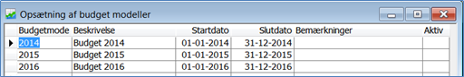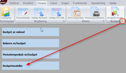 Før du kan indtaste budgettal, skal du oprette budgetmodeller. Der oprettes typisk én budgetmodel for hvert regnskabsår. Klik på den lille firkant ud for Budget for at åbne for oprettelse af budgetmodeller (klassisk menu: Opsætning –> Diverse –> Budgetmodeller):
