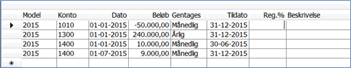- Reg%: Budgetbeløb vil for hvert interval øges med den indtastede procent. F.eks.: januar budget = 10.000. regulering indtastet = 10%. Februar budget vil således være kr. 11.000, marts budget 12.000 o.s.v.