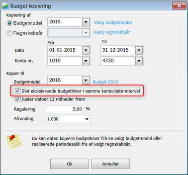 Udfyld skærmbilledet efter hvad du ønsker kopieret, evt. regulering, afrunding af beløb m.m.