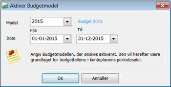 Øverst vælges budgetmodel du vil arbejde med. Tryk på "OK", og start- og slutdatoer udfyldes automatisk: