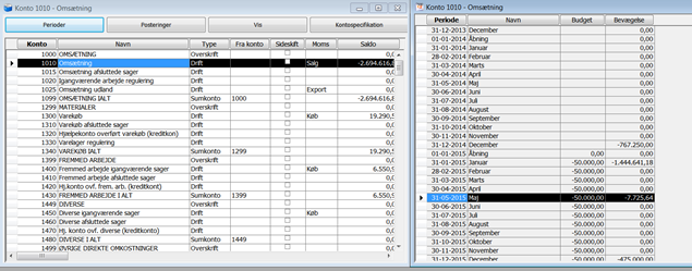 Tip: Hvis du placerer de 2 skærmbilleder ved siden af hinanden, kan du bladre dig ned igennem kontoplanen. Når du skifter konto, skiftes periodebilledet automatisk