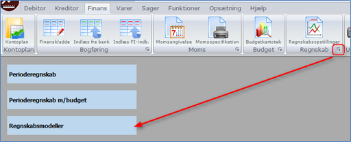 Klik på den lille firkant ud for Regnskabsopstillinger for at oprette modellerne (klassisk menu: Finans ->Opsætning -> Diverse -> Regnskabsopstillinger)