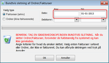 Her kan slettes bogførte fakturaer, samt ordrer der endnu ikke er fakturerede.