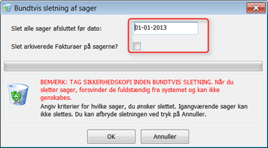 Her kan slettes afsluttede sager. Du kan vælge samtidig at få slettet fakturaer bogført på de aktuelle sager