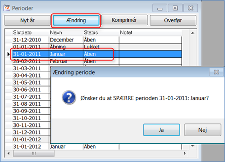 Når perioderne er spærret skal de lukkes. Vend tilbage til den 1. periode der skal komprimeres, klik på knappen "Ændring". Svar nu "Ja" til at LUKKE perioden: