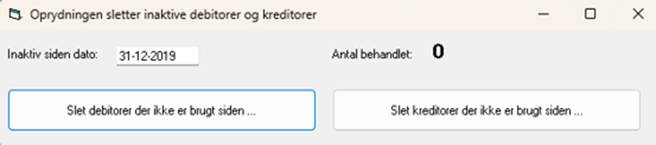 Funktionen ligger under: Funktioner -> Generelle funktioner -> Oprydning. Den sletter inaktive debitorer og kreditorer indenfor en given dato.