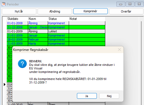 Når hele året er lukket, kan perioderne komprimeres. Bemærk at andre brugere skal lukke EG Visual før komprimeringen kan startes.