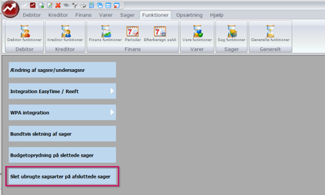 Vælges under: Funktioner -> Sags funktioner -> Slet ubrugte sagsarter på lukkede sager.