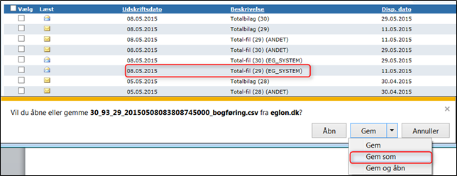 Find bogføringsbilag for lønkørslen der skal bogføres – OBS du skal vælge den linje hvor der i parentes står EG_SYSTEM. Klik på linjen, og der kommer PopUp i bunden af skærmen, hvor du vælger Gem -> Gem som: