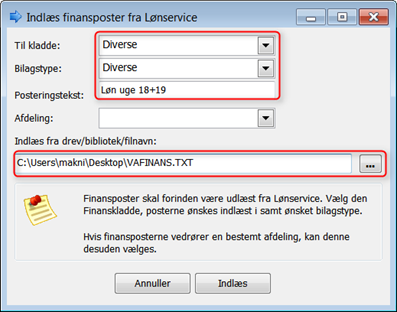 OBS: Inden der kan udlæses fil fra Lønservice, skal Finans kontonumre fra din kontoplan, sættes på lønarterne i EG Lønservice. se minivejledning "L03 Kontering i Lønservice" for hjælp til dette