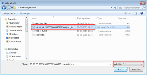 Dernæst skal du udpege bogføringsbilaget du tidligere udlæste fra EG Lønservice: Klik på boksen ud for stien til filen. Udvælg filen, HUSK evt. i bunden at vælge "Alle filer", før filen kan ses:
