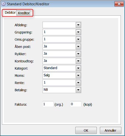 Det er muligt at definere en række standard oplysninger, som benyttes som forslag når der oprettes nye debitorer og kreditorer. For opsætning af disse standard felter vælges i menuen Opsætning -> Generelle opsætninger -> Standard debitor/kreditor (klassisk menu: Opsætning -> Diverse -> Standard debitor/kreditor).