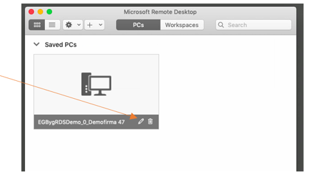 Klik på RDP filen som du lige har trukket over i appen, herefter klikkes på blyanten i RDP filen.